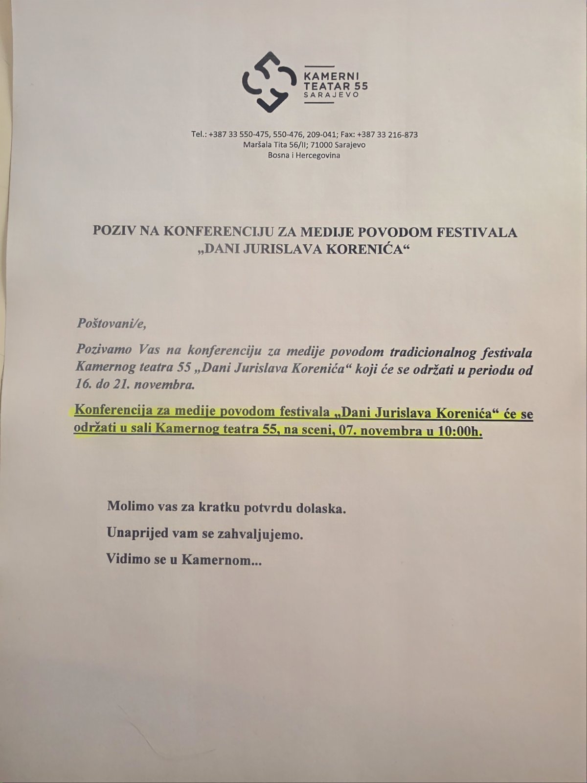 Festival Dani Jurislava Korenića bit će održan u Kamernom teatru 55 od 16. do 21. novembra